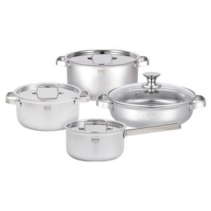 스테니 인덕션 스테인리스 냄비 세트는 16cm 편수, 20cm 양수, 24cm 전골, 24cm 곰솥으로 구성되어 5중 구조와 무연마제로 열전도와 내구성이 뛰어나며, 다양한 요리를 안전하게 조리할 수 있는 주방용 세트입니다.