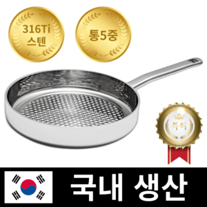 국산 316Ti 스테인리스 후라이팬은 통5중 구조로 열전도와 내구성이 뛰어나며, 인덕션 사용이 가능하고 실버 색상으로 깔끔하며 다양한 요리를 안전하게 조리할 수 있는 주방용 팬입니다.