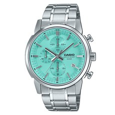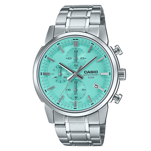 CASIO MTP-E510D-2A는 민트 컬러 다이얼과 스테인리스 스틸 밴드를 갖춘 아날로그 크로노그래프 손목시계로 세련된 디자인과 실용성을 동시에 제공하며 일상 착용과 포멀한 자리 모두에 어울립니다.