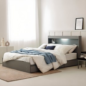 동서가구 이즈 카이 침대는 모던한 그레이와 화이트 조합의 1단 LED 조명과 3서랍 수납 기능이 포함된 실용적인 침대 세트로, 본넬 양면 매트리스가 포함되어 편안한 수면과 효율적인 공간 활용을 제공합니다.